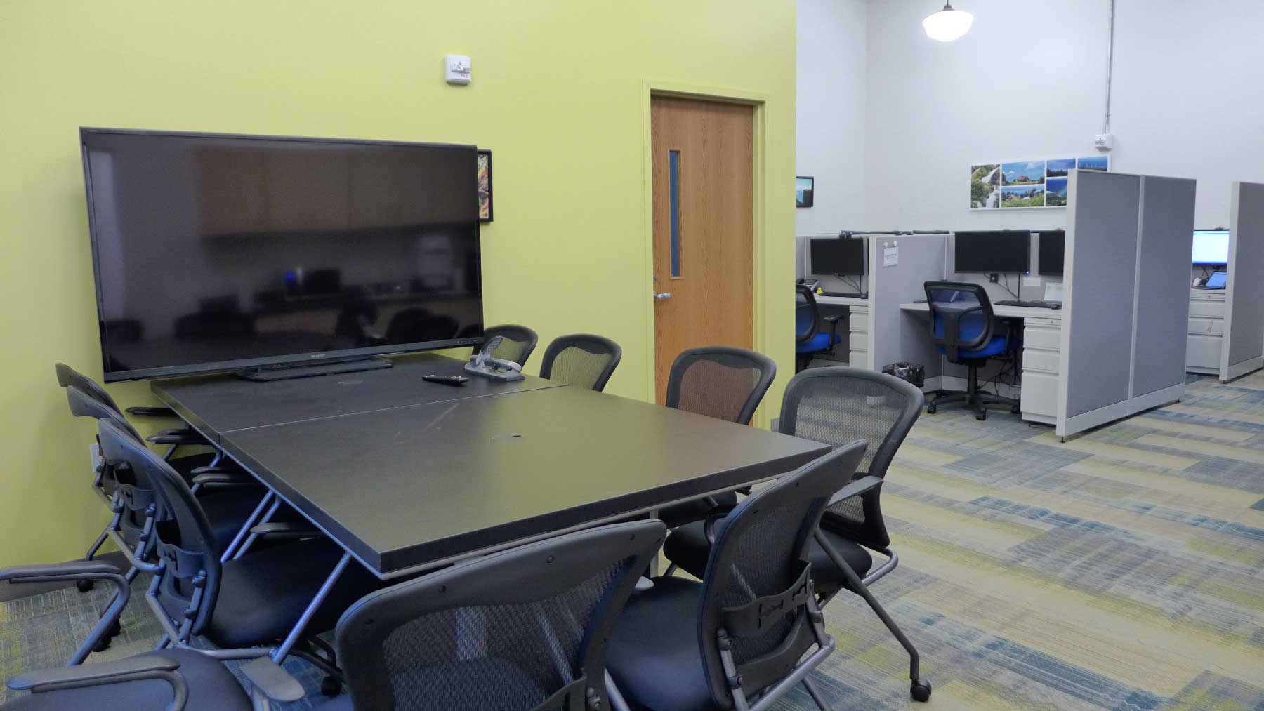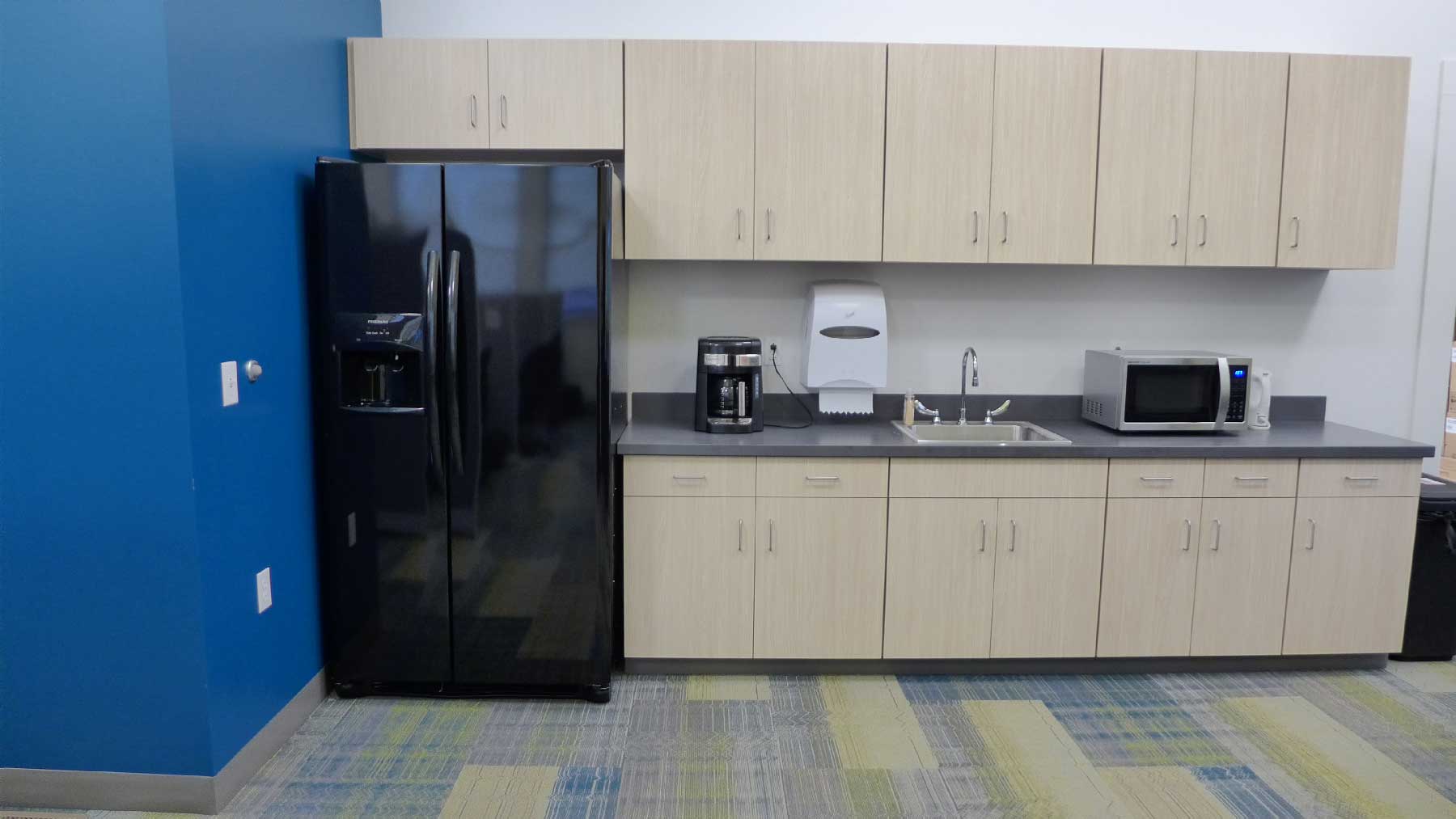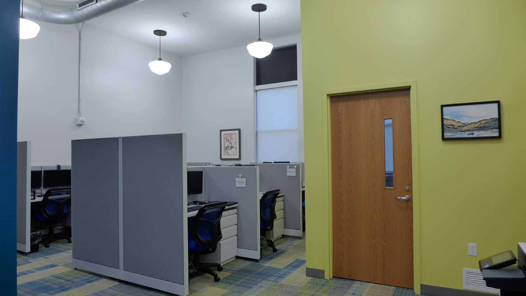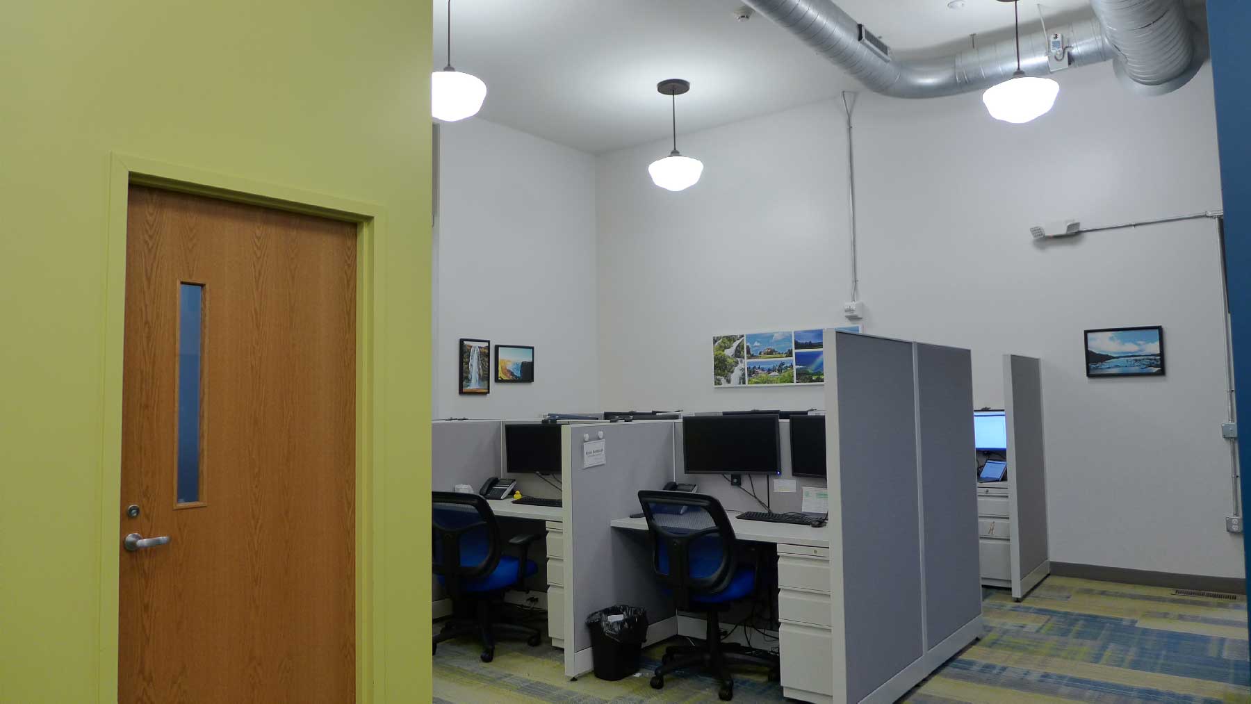 Key interior design features include new open office areas, new restroom facilities and a kitchen. Exposed spiral ductwork and schoolhouse style lighting give tribute to the building’s past.