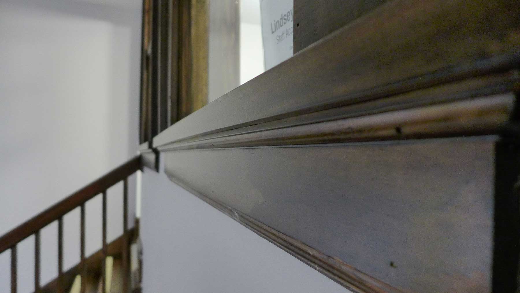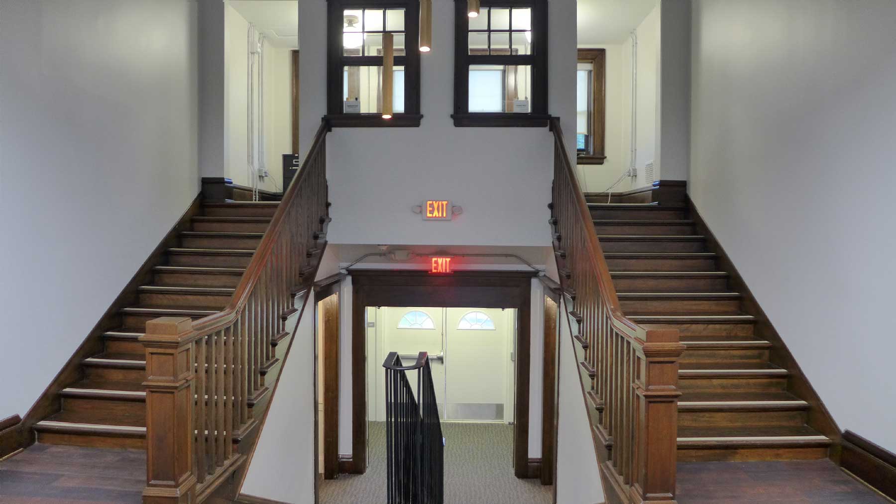 The original ornate wooden double staircase that once led to a small principal’s office on the 2nd floor was restored to its former glory.