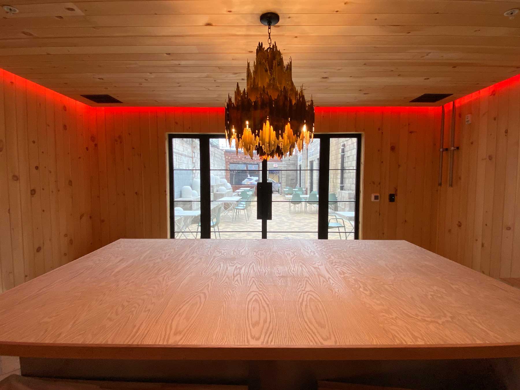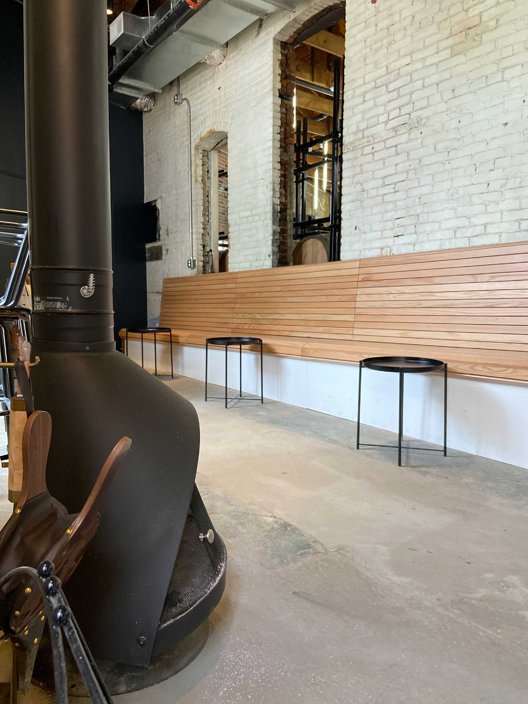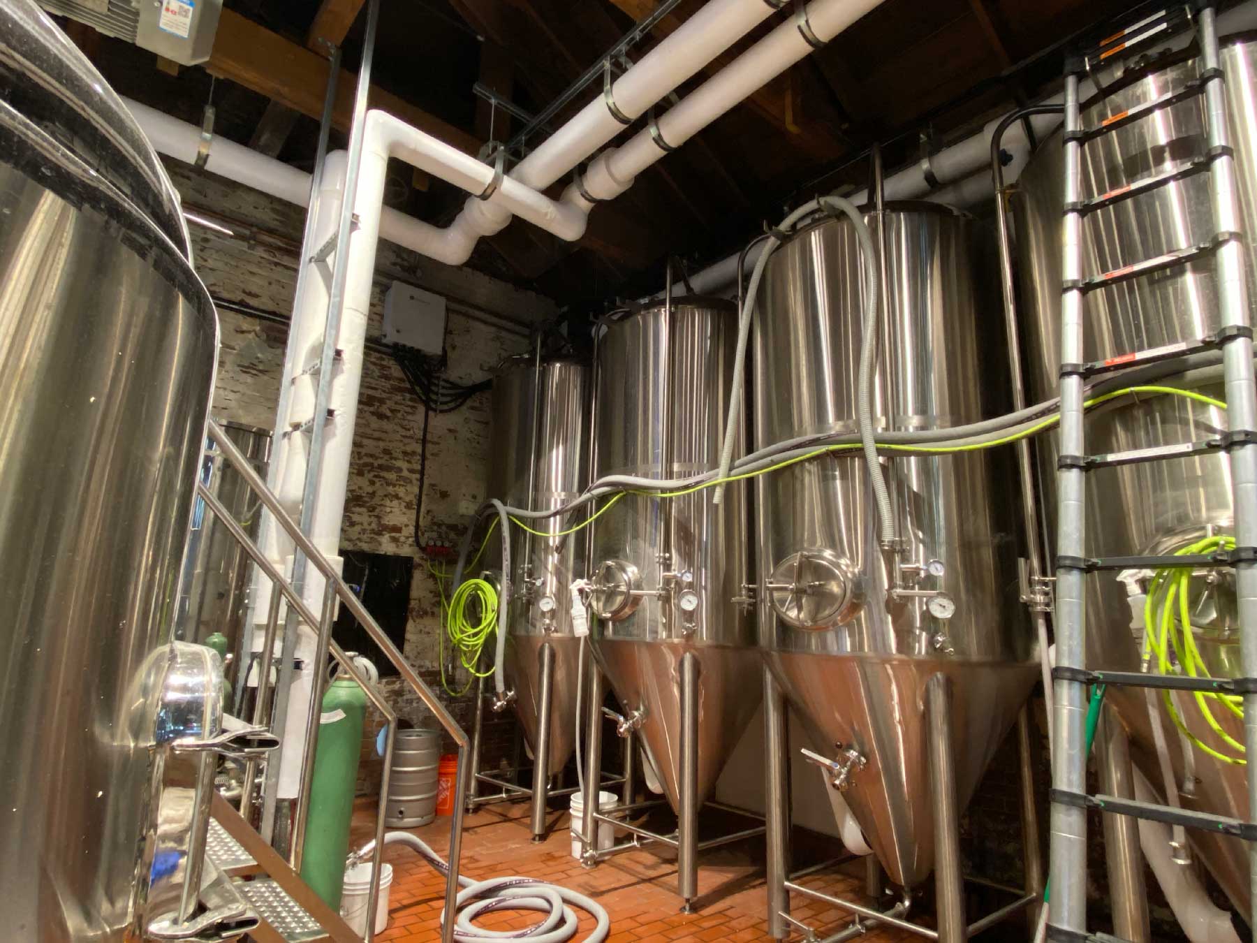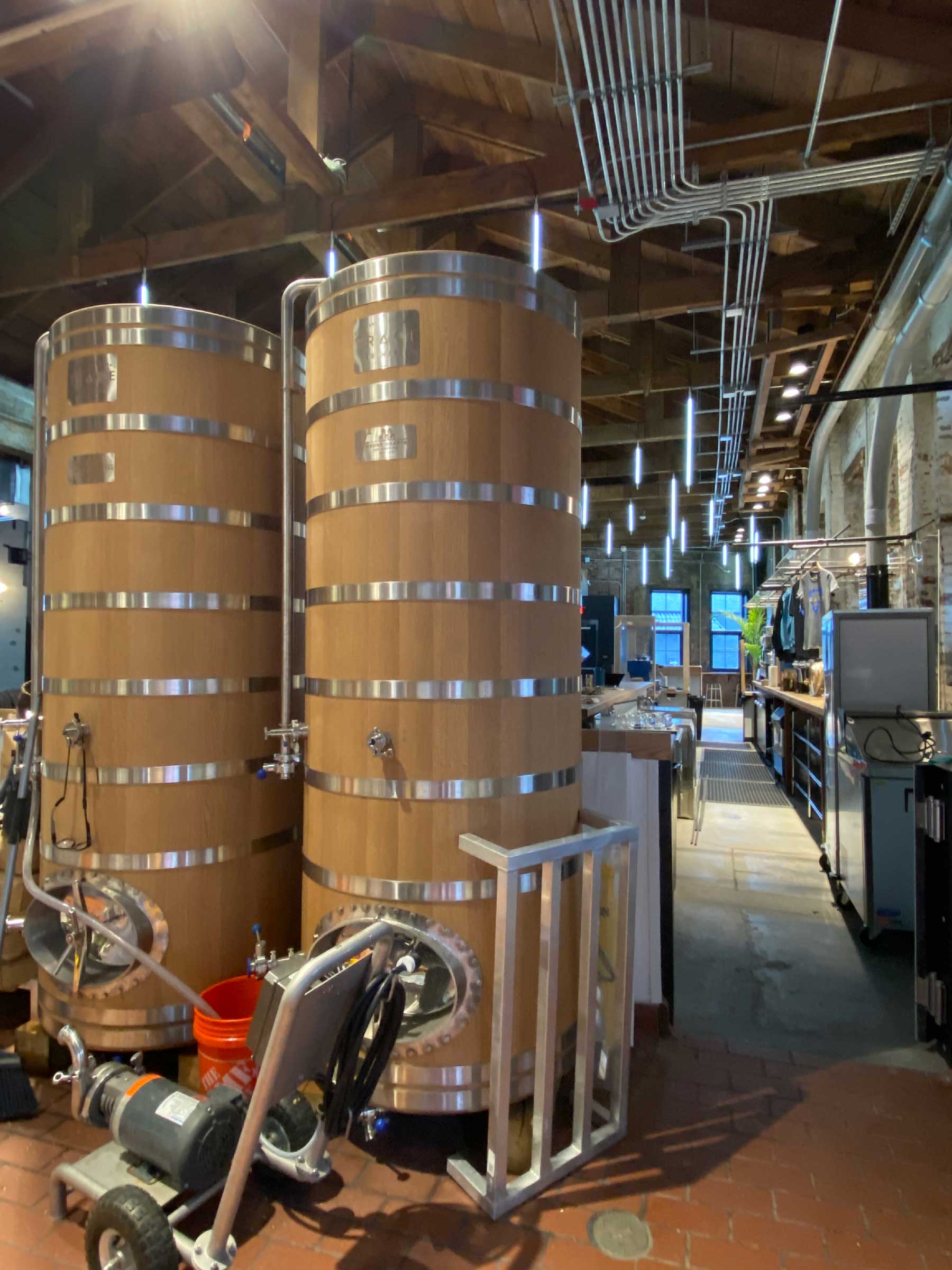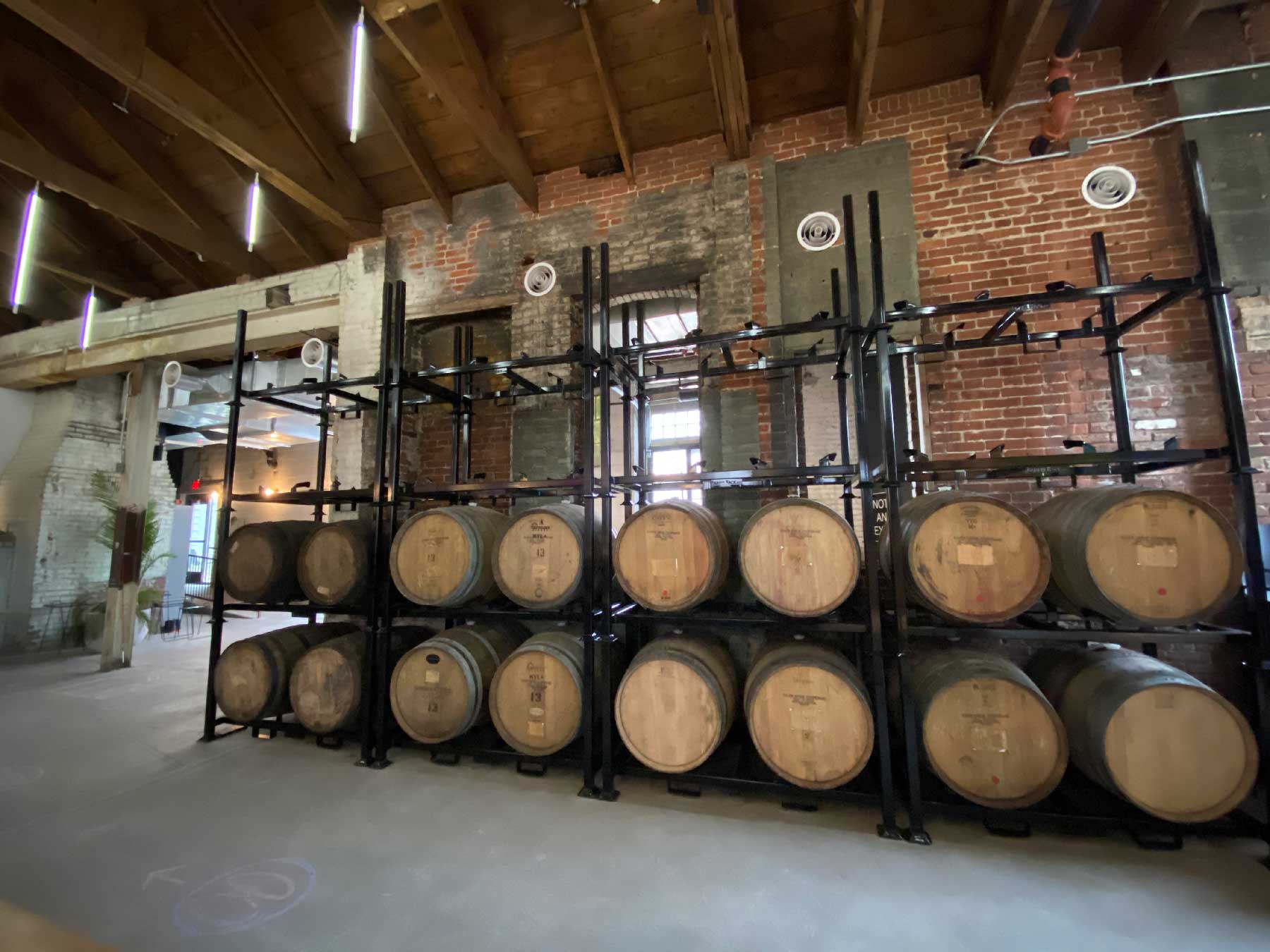 In addition to the traditional beer making techniques brewed on property, patrons can spend time in the Koelschip room, located off the open-air courtyard via large glass doors, where Belgian Style beer is spontaneously fermented in a large open stainless-steel tub in the center of the room. The open-air brewing technique pulls out notes from the tongue and groove exposed pine walls and ceiling. Once completed it is aged in wooden bourbon and wine barrels displayed in the tap room on large steel racks.