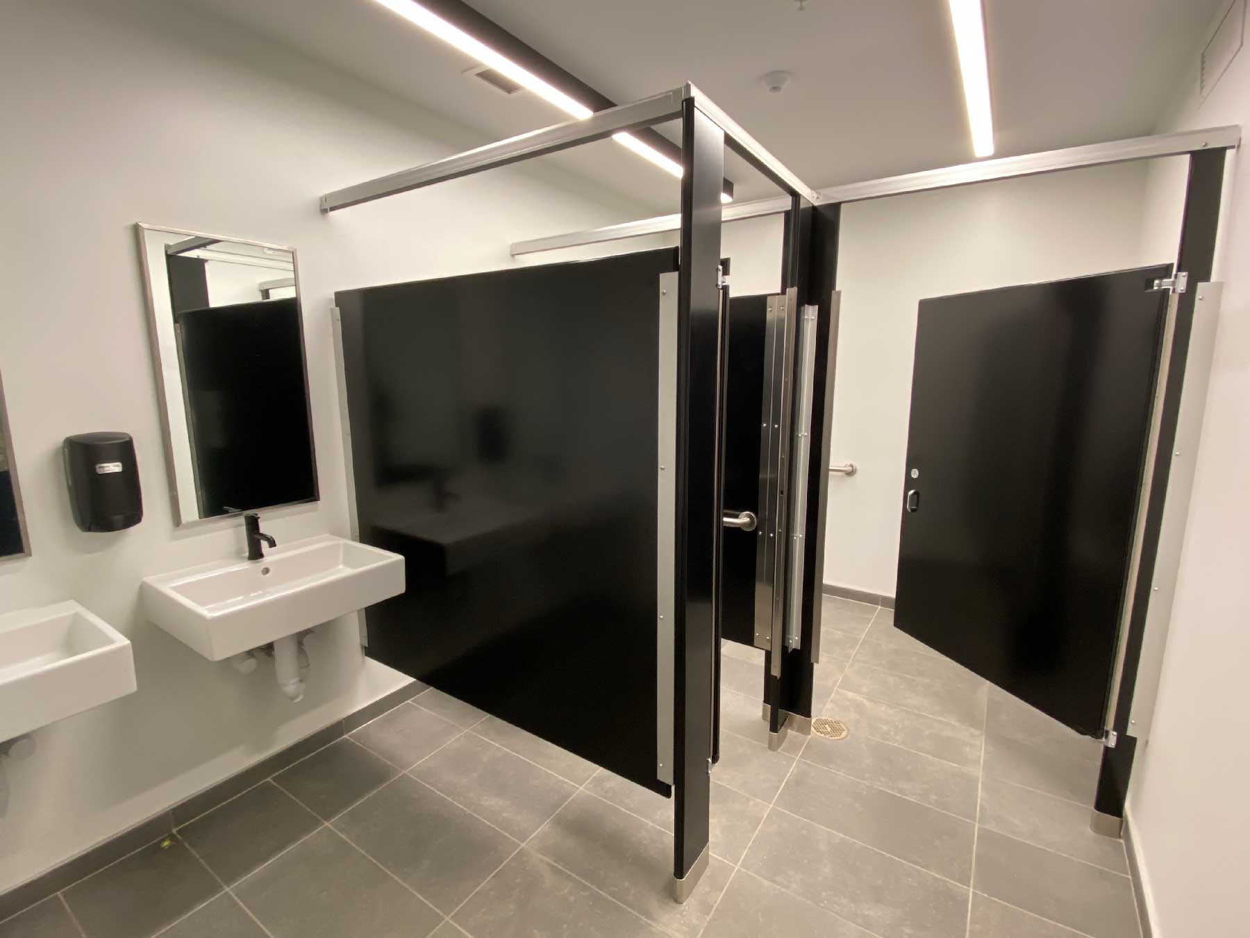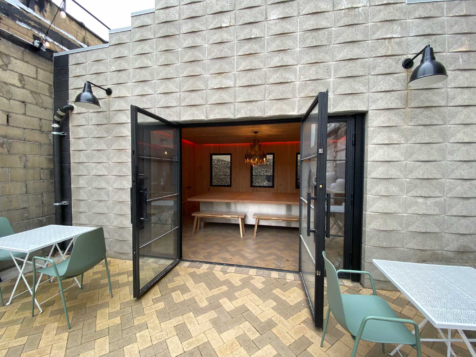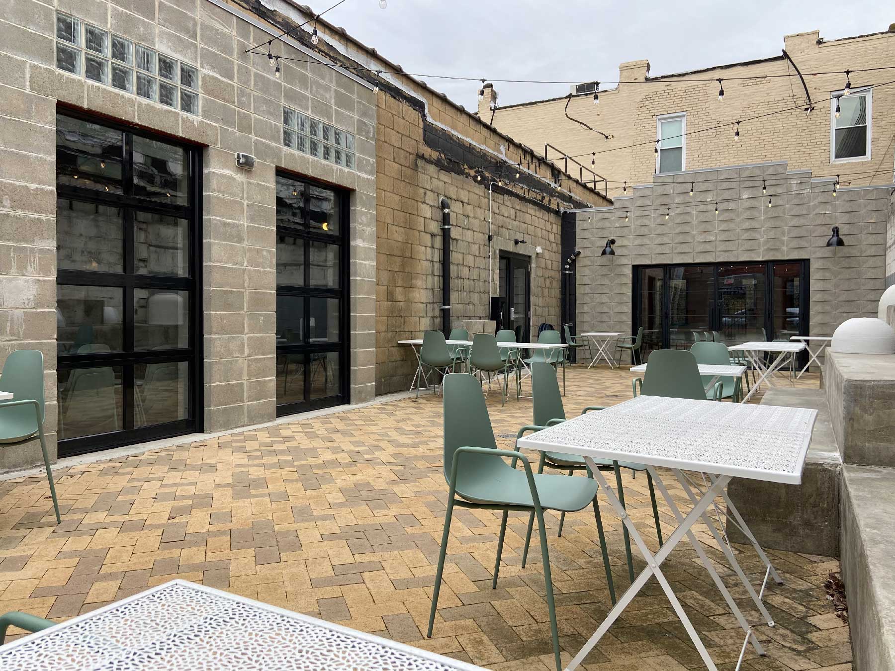 The roof structure of an old addition was completely removed to create an outdoor courtyard with new concrete stadium seating. Three new roll up glass doors were installed opening the interior to the courtyard.